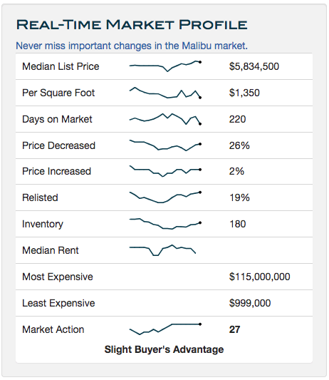 This week the median list price for Malibu, CA 90265 is $5,834,500 with the market action index hovering around 27. This is about the same as last month's market action index of 27. Inventory has held steady at or around 180.